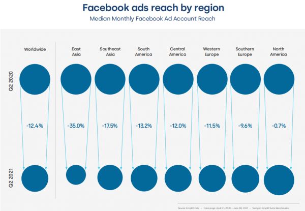 注:2021年Q2,全球范围内Facebook平台上的广告触达率下降12.4%(来源:emplifi)