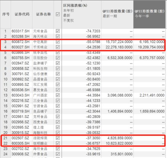 此外据统计,今年跌幅较大的食品饮料个股中,中炬高新、千禾味业、恒顺醋业、涪陵榨菜等,都获得了QFII(合格境外机构投资者)的大幅增持(新增)。美林国际二季度加仓306万股千禾味业,站稳公司第三大流通股股东位置;瑞银资管新进482.7万股涪陵榨菜及1561万股的恒顺醋业。