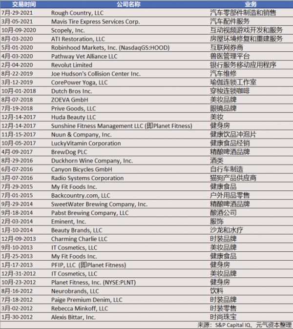 2012年至今,TSG的投资绝大多数投资分布在大消费相关品类上(来源:S&P Capital IQ)