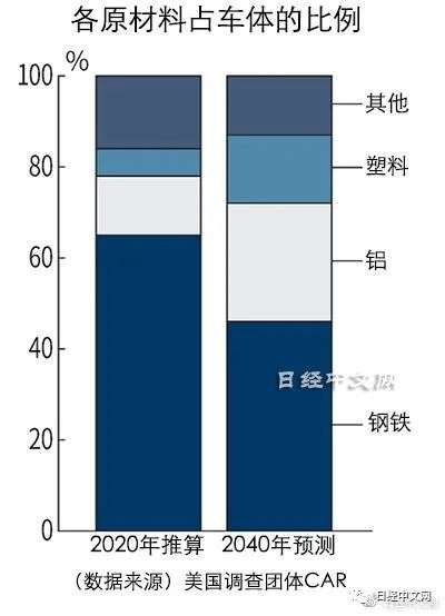 但是,美国调查团体CAR的统计显示,钢铁占车体材料的比例将从2020年的65%降至2040年的46%。特斯拉积极采用铝等,包括塑料和碳纤维在内,钢铁以外的材料正在提高存在感。纯电动汽车需要装载沉重的电池以提高延长续航距离,因此车体的轻量化变得不可或缺。