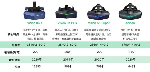 具体产品方面,小派科技目前已面向不同用户群体推出丰富的产品系列,包括 Vision 8k X(顶配 PC VR 头显,双 4K)、Vision 5K Super(刷新率 180Hz)、Artisan(性价比之选),定价在 449 美元到 1299 美元之间。