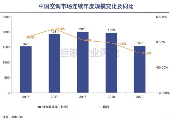 2020年的疫情对于空调行业是不小的打击。奥维云网数据显示,当年国内空调零售额规模同比下滑了21.9%。