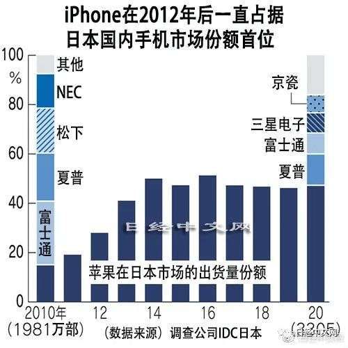 据美国调查公司IDC的数据,苹果公司2012年在日本国内智能手机市场登上了份额首位宝座。从2011年推出的iPhone4S开始,在通信运营商方面,除了软银(Softbank)之外,日本消费者还可以从KDDI(au)购买,用户因此而迅速增加。份额方面,苹果超过富士通、夏普等日本国内厂商,2014年以后份额始终保持在50%左右,苹果一家独大的局面一直得以维持。
