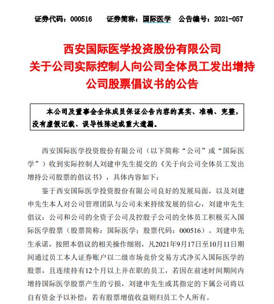 9月16日晚间,国际医学发布公告称,公司实控人刘建申承诺,按照本倡议的相关操作细则,凡2021年9月17日至10月11日期间通过员工本人证券账户以二级市场竞价交易方式净买入国际医学的股票,且连续持有12个月以上并在职的员工,若因在前述时间期间内增持国际医学股票产生的亏损,刘建申或其指定的下属公司将以自有资金予以补偿;若有股票增值收益则归员工个人所有。