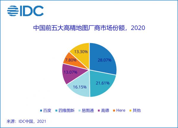 技术输出则主要面向大B客户,比如面向车企、自动驾驶企业提供高精度地图的数据服务。IDC统计的数据显示,2020年中国高精度地图市场总量达到4.74亿元人民币,增速达70%。其中百度地图以28.07%的市场份额领跑,高德所占份额为13.07%。
