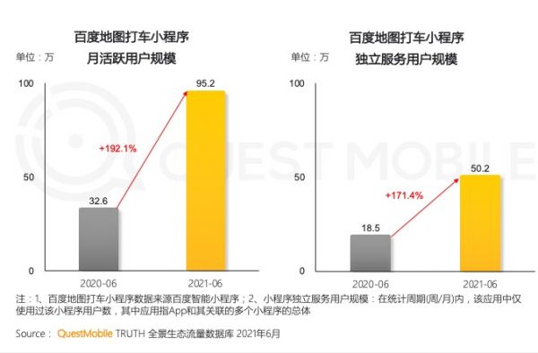 与之对应,地图APP的打车业务表现可圈可点。据晚点报道,7月份高德日单量已达400万-500万单,在网约车市场属于仅次于滴滴的存在。QuestMobile统计的数据显示,6月份百度地图打车小程序的月活规模同比实现192.1%的大幅增长。