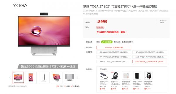如果你真的想购买一体机的话,那么你还应该知道,在同样价位下,消费者还有很多可以选择的产品。如果你在乎显卡性能,那么联想YOGA 27 2021应该是个不错的选择。联想YOGA 27 2021可选AMD R7 5800H处理器+最新款的锐龙RX6600M独立显卡,搭配16G内存+2T HDD+512G SSD存储配置。双风扇六热管散热系统,使得这款产品双烤可以达到65W+100W的理想性能。