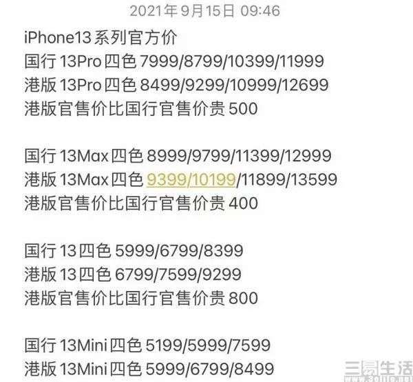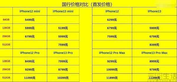 此次iPhone 13与iPhone 13 mini在取消了64GB存储版本后,起始容量就已达到128GB,售价分别为5999元和5199元,相比于上代的iPhone 12和iPhone 12 mini价格下调了800元。并且iPhone 13 Pro和iPhone 13 Pro Max对比上一代产品,也分别在起售价上降低了500元和300元。