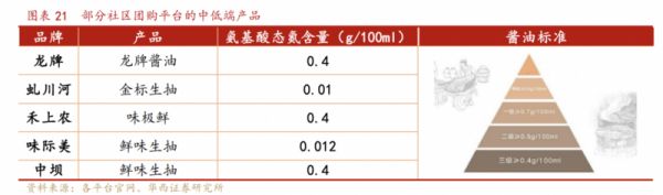 这些产品往往走低价路线,因而常常走向削弱产品质量、规格的道路。据华西证券调研,目前社区团购平台上架的酱油,从中坝、龙牌、虬川河等中小品牌,到海天、中炬等大品牌的主推产品,氨基酸态氮含量大多仅有0.4/0.5g/100ml,而现在大多数厂家都可以生产氨基酸态氮含量0.8以上规格的酱油。