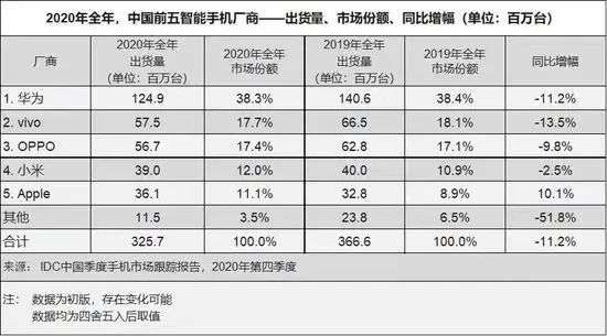 市场调研机构IDC公布的2020年中国智能手机出货量排名显示,2020年苹果位居第五,前四名一水儿的中国品牌:华为、Vivo、OPPO、小米。