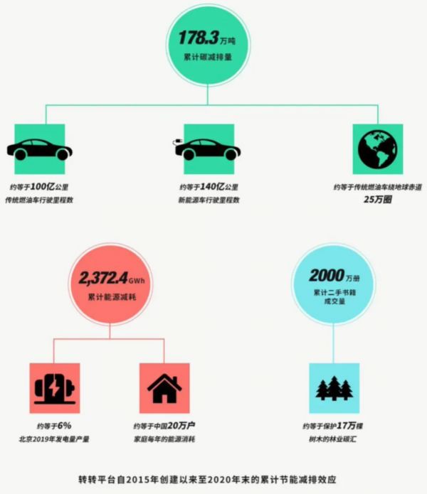 上述报告统计,从2015年创建至2020年末,转转平台上包括二手手机在内的闲置交易,已累计达成碳减排量高达178.3万吨,约等于燃油车行驶100亿公里的碳排放量;累计能源减耗2372.4GWh,比肩于2019年北京发电总量的6%。