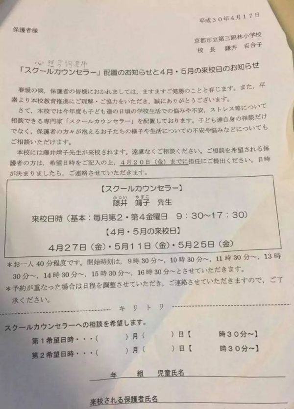 几乎每天,孩子的书包里都有各种信件,是校方认为需要家长知晓的信息,重要的内容还需要签字交回执。例如每个月学校有心理辅导师入驻学校,帮助个别的孩子和改善亲子关系,信件会注明辅导师的背景、预约时间表。偶尔会有“普通救命讲习会”,是左京区消防署联合举办的,需要家长报名参加;关于地震的演练,则是家长必须参加的,万一地震发生,家长和学校都要迅速无误地衔接。最让我吃惊的是,学校还写信要求孩子的水壶不要有冰块,禁止直接用水壶喝水,必须倒进杯子里喝;不要和别人交换喝水等。信件是关于生活的一切,包括我能想到的,以及我想不到的。