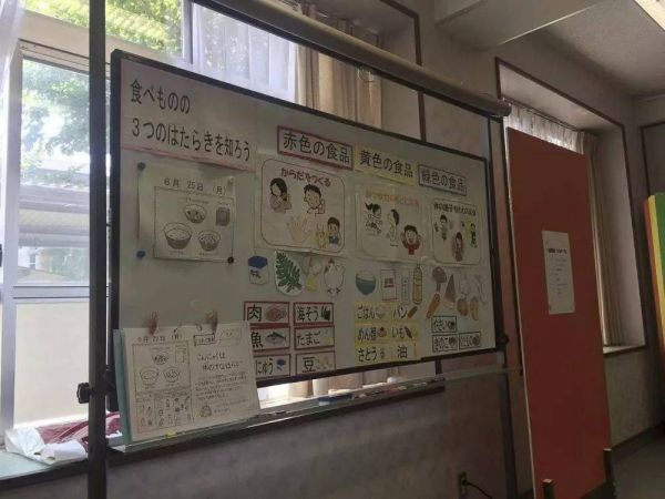 午餐开始时,班主任在墙上贴一张当日食谱,用幻灯片放出来,给孩子们解释,当天午餐用了什么食材。吃得最快最好的孩子,可以得到奖励——墙上的当日食谱。