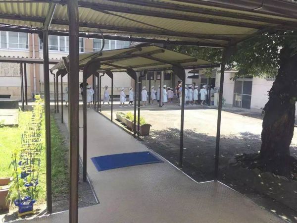 2018年6月25日,京都市立第三锦林小学的学生排队,等待搬运午餐。摄影:罗洁琪