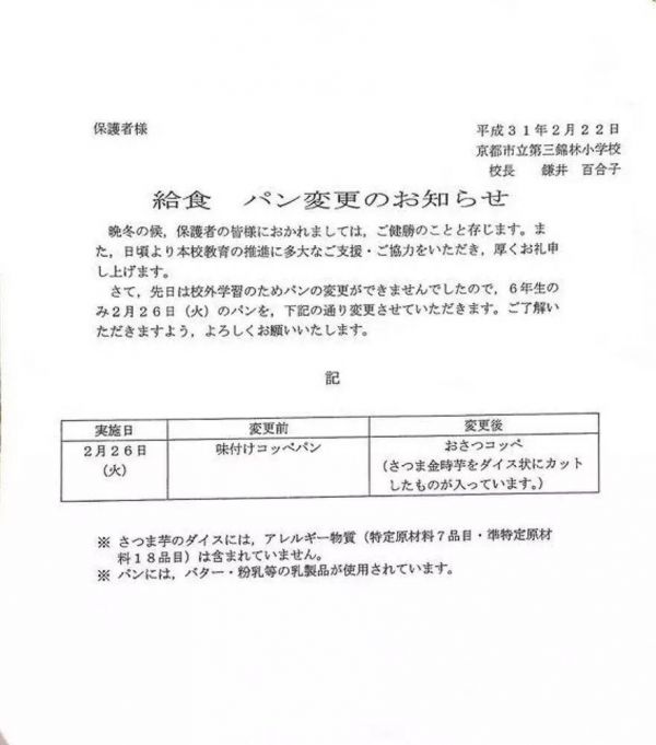 在日本时,有一天,女儿带回一封道歉信,解释前几天的菜单出了错,某一样蔬菜的菜名和克数写错了,需要更正。信件列明责任人,还有校长签名。如果家长对此有疑问,或者有意见,可以在回执上申诉。