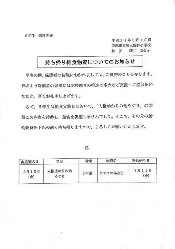 校方解释,午餐的食材是京都市政府安排统一配送的,开学后的前三天,需要家长准备便当。第二个星期才开始提供午餐。从那以后,每周五放学时,孩子的书包会有一封信,黄色的狭长信封,上面打印着“保护者样”的字眼,里面是下一个星期的课程表,需要准备的衣服、体育用具,午餐的菜单,角落里还备注着菜谱。学校的所有信件,右上角都会有校长的名字。