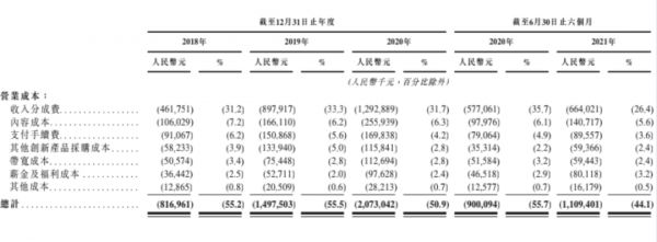 2018年、2019年、2020年以及截至2021年6月30日,喜马拉雅的营业成本为8.17亿、14.98亿、20.73亿以及11.09亿元,分别占总收入的55.2%、55.5%、50.9%和44.1%。