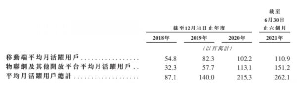 不过,喜马拉雅的用户数据一直在稳步增长。招股书显示,喜马拉雅2018、2019、2020年的平均月活跃用户总计为8710万、1.4亿和2.15亿人次,2021年上半年为2.62亿人次,其中包括1.11亿移动端平均月活跃用户和1.51亿物联网及其他平台月活跃用户。