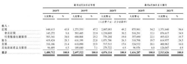 从收入明细上看,喜马拉雅的订阅也是收入主力,2018年、2019年、2020年及2021年上半年,其订阅收入分别为6.49亿、12.74亿、20.07亿及13.72亿元,分别占总收入的43.8%、47.2%、49.2%及54.6%。