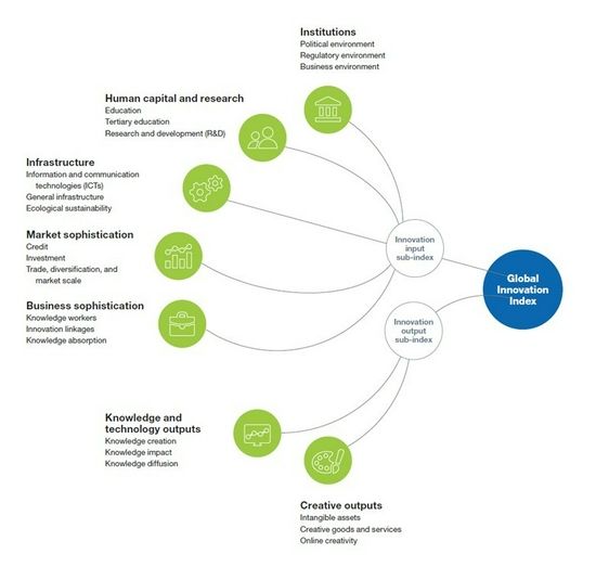 2021年的GII是第十四版,每年发布,其核心是提供衡量表现的指标并对132个经济体的创新生态系统进行排名,以两个次级指数的平均值计算。其中,创新投入次级指数衡量的是支持和促进创新活动的经济要素,这些要素共分为五大类:制度、人力资本与研究、基础设施、市场成熟度和商业成熟度。创新产出次级指数则体现的是经济中创新活动的实际成果,分为两大类:知识与技术产出和创意产出。