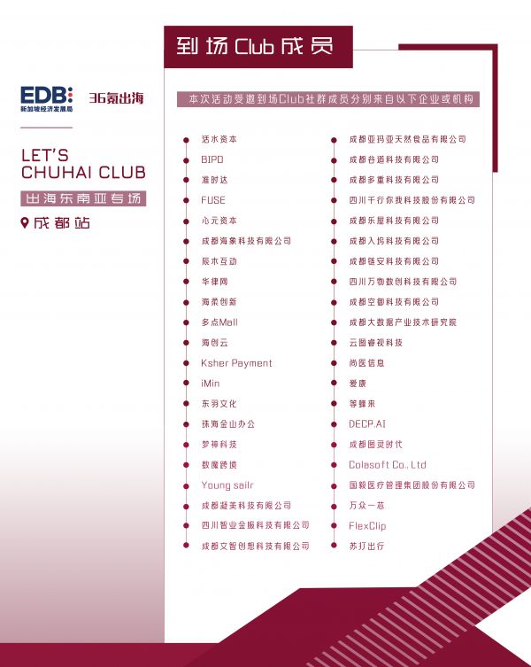 新加坡经济发展局(EDB)是新加坡贸易与工业部属下的法定机构,负责规划新加坡经济战略,旨在加强新加坡作为全球商业,创新和人才中心的地位。在今年,为了进一步促进东南亚与中国的市场交流与合作,EDB将联合36氪出海共同举办“LET'S CHUHAI CLUB-出海东南亚系列沙龙”活动,旨在架起两地新经济生态桥梁,助力企业全球化发展。