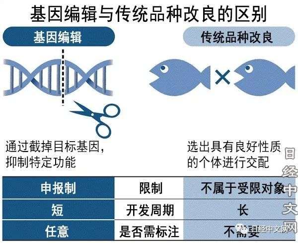 日本厚生劳动省2019年10月针对基因编辑食品制定出一项制度:如果判断认为安全性方面与传统品种改良没有差异,只需申报即可进行流通销售。不需要像转基因食品那样接受安全性审查。
