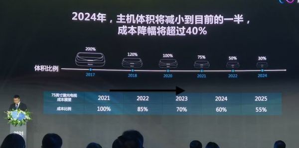 根据海信集团控股公司副总裁于芝涛在大会上的预测,按照海信的技术规划,到2024年,客厅场景下的主机体积将减小到目前的一半。减小主体体积的激光电视将推动场景适应性,促使激光电视能够在更多家庭客厅场景下简洁的安装。