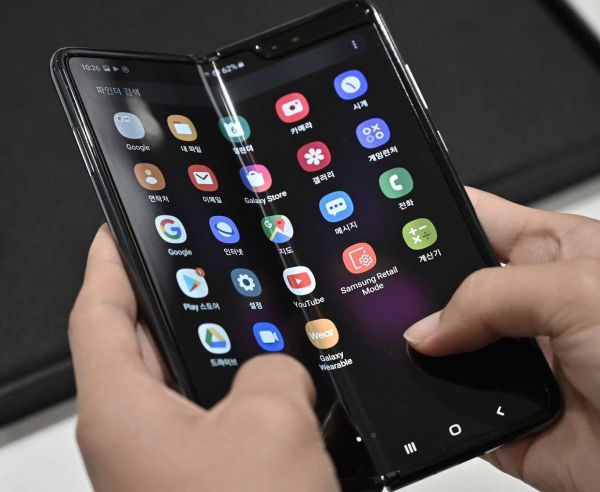 致力于竞争:三星在2019年推出了自己的柔性显示屏手机系列。这里展示的是该公司的Galaxy Fold。图片来源: JUNG YEON-JE/AFP/GETTY IMAGES