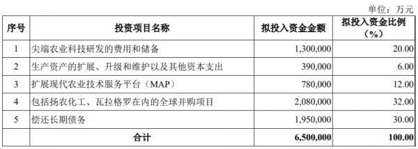 具体来看,在募资项目中,130亿元计划投入尖端农业科技研发的费用和储备,39亿元用于生产资产的扩展、升级和维护以及其他资本支出,78亿元用于扩展现代农业技术服务平台(MAP),208亿元用于包括扬农化工、瓦拉格罗在内的全球并购项目,其余195亿元用于偿还长期债务。