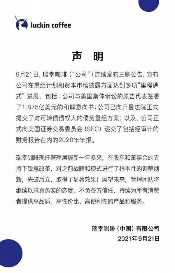 9月21日晚,瑞幸咖啡发布声明称,公司今日发布三则公告,宣布公司在重组计划和资本市场披露方面达到多项“里程碑式”进展,包括:公司与美国集体诉讼的原告代表签署了1.875亿美元的和解意向书;公司已向开曼法院正式提交了对可转债债权人的债务重组方案;公司正式向美国证券交易委员会(SEC)递交了包括经审计的财务报告在内的2020年年报。
