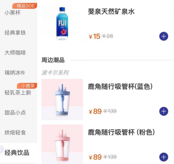 现在打开瑞幸的小程序可以看到,除了咖啡以外,菜单栏里还有瑞纳冰、轻乳茶、甜品小点、烘焙轻食、经典饮品和潮品周边,连矿泉水和湿巾、帆布袋都被纳入销售范围内。