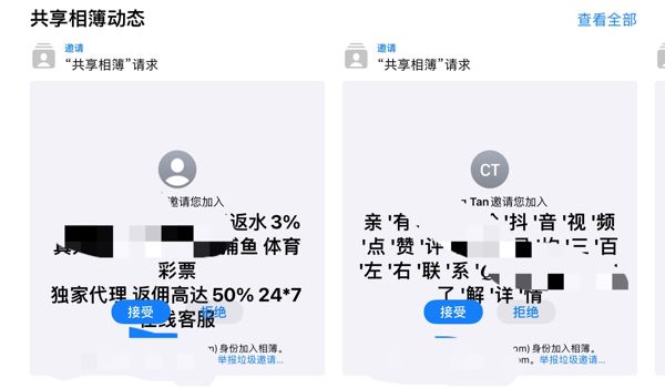 你以为这就万事大吉了吗?诈骗团伙在遭遇电话、信息阻碍之后,又盯上了另一个功能:共享相册。苹果为了让亲朋好友之间可以快速共享照片,提供了共享相册功能:创建共享相册的人可以直接邀请别人加入自己的相册中,查看共享相册中的内容。而收到邀请的人,就会在相册里收到虚假的邀请信息。