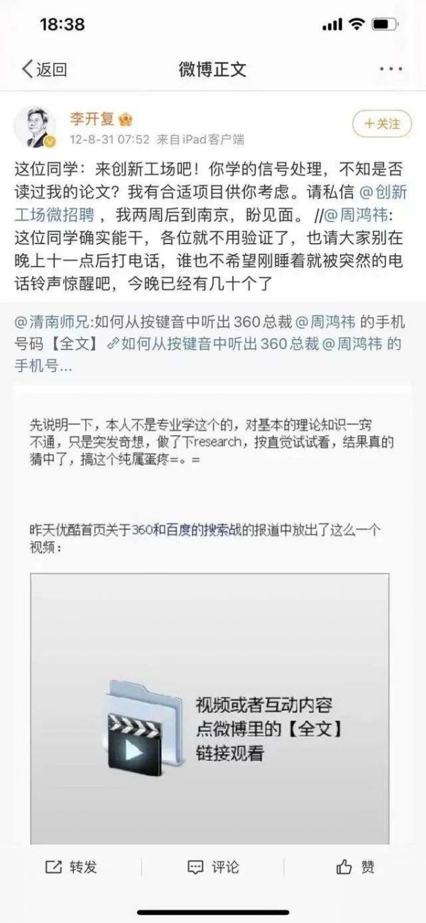 同年9月,360董事长周鸿祎接到了一通神秘电话,电话那边就是读大二的刘靖康。令人惊讶的是,他获晓周鸿祎的电话号码竟是破译了记者电话采访周鸿祎时的按键声。周鸿祎非但没怒,还连发两条微博“认”了,并大度地说“这名同学确实能干”。