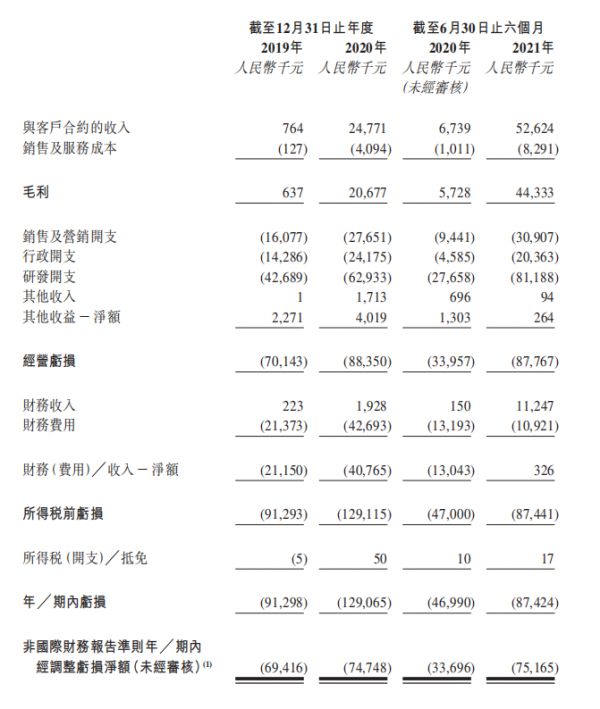 招股书显示,2020年以及截至2021年6月31日的六个月,公司的收入分别为(人民币,下同)2477万元、5262万元;毛利分别为2068万元、4433万元。同期,毛利率分别为83.5%、84.2%。