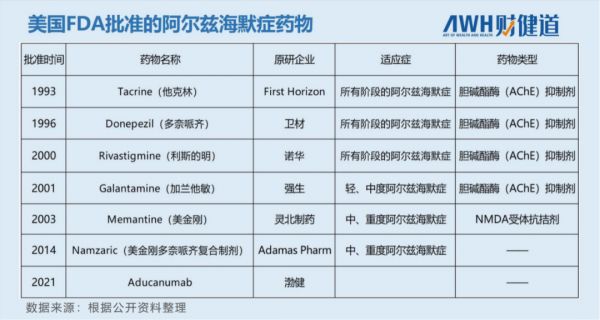 至今,FDA批准的7种药物,均属于辅助性治疗药物。2003年上市的美金刚属于兴奋性氨基酸受体 (NMDA) 抑制剂,其余还有四款药物均为胆碱酯酶 (AChE) 抑制剂。最早出现 (1993年) 的他克林,由于毒副作用大,目前已经退市;FDA在美金刚 (2003年) 上市后的11年,才批准了唯一一款新药,即复方美金刚+多奈哌齐的联合用药。
