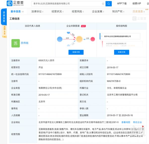 5月20日,据企查查数据显示,易手车(北京)互联网信息服务有限公司成立于5月17日,注册资本6500万元,法定代表人为苏伟铭。大股东为大众汽车(中国)投资有限公司,持股比例34%,另外两个股东:一汽-大众汽车有限公司、上汽大众汽车有限公司分别持股33%。经营范围包括互联网信息服务、拍卖、销售汽车、摩托车及摩托车配件、电子产品和承办汽车展览等业务。