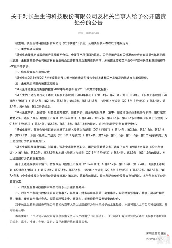 深交所20日发布公告称,因重大事项未披露、信息披露存在虚假记载、未在规定期限内披露定期报告,对长生生物科技股份有限公司及相关当事人给予公开谴责处分。