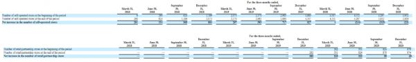 这也意味着加盟店除了瑞幸咖啡加盟店,也包含小鹿茶门店,而小鹿茶在2020年下半年便更名为“瑞幸咖啡”,也停止了加盟。与此同时,瑞幸咖啡在2021年初推出新零售合作伙伴招募计划,宣布放开加盟。因此,加盟店才会扩增迅速。