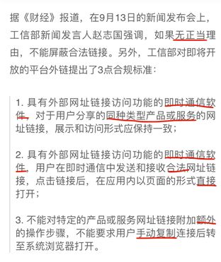 9月9日,工信部有关部门召开“屏蔽网址链接问题行政指导会”,与会企业包括阿里、腾讯、字节跳动、百度、华为、网易等。工信部在会上提出有关即时通信软件的合规标准,要求9月17日前,各平台必须按标准解除屏蔽,否则将采取执法措施。