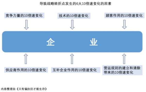 安迪·格鲁夫定义“战略转折点”是“一个企业生命过程中即将发生根本性变化的时刻”。这里的“根本性变化”,是指企业所在的产业环境里某一个重要因素发生了“10倍速变化(a ‘10X’ Change)”,在短期内势力增至原来的10倍,导致企业的竞争力发生了根本性变化。