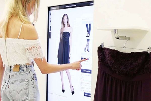 在试衣间里有一个大的触摸屏,顾客可以在上面直接挑选款式、尺码。此外,这个系统还可以根据顾客已经选择的服装,推荐搭配款式。
