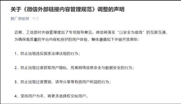 工信部带头,巨头们歇战,一场“多APP间互开外链”的运动正如火如荼。17日,应此前工信部解除屏蔽外链的要求,“头号国民应用”微信发布通告,这款顶流APP终于在大家的热切期盼下走向“开放”,创造了一个可能的历史性时刻。