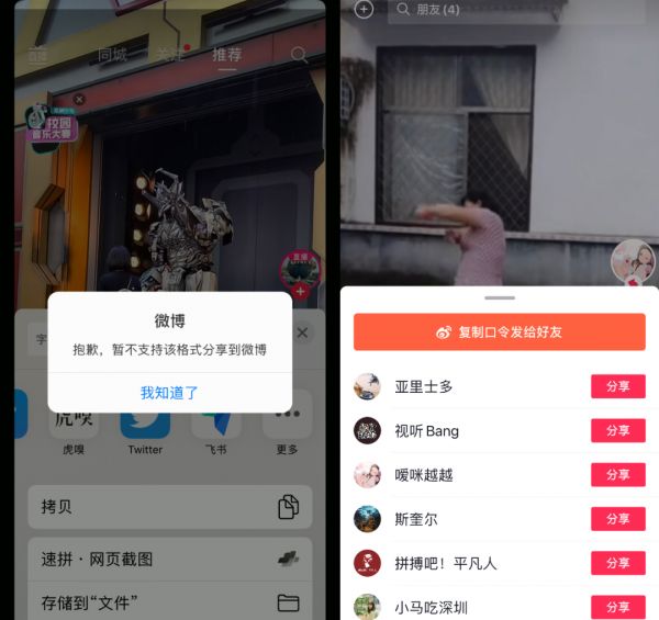 但另一方面,各平台在执行层面的“私心”还有很多,现阶段多数平台并未积极响应工信部的“开放”要求。例如,微信虽给淘宝开放外链,但会弹出警示“中转页”,转至淘宝首页后也无法使用微信支付;从抖音分享视频到微博,则显示“不支持格式”或仍需复制口令转发,无法获得与微博原生视频相同的观看体验。