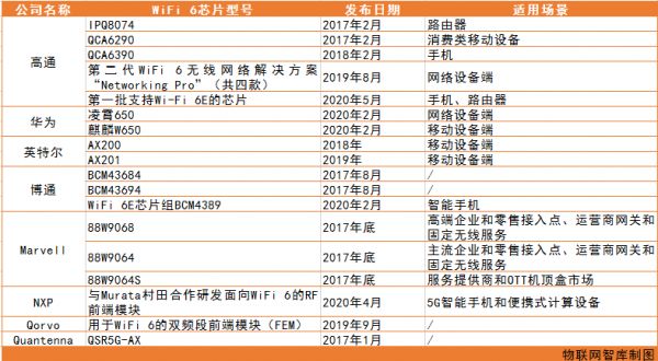 物联网智库整理了部分厂商的WiFi 6芯片产品及发布日期、应用场景,如下图: