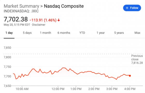 标普500指数收跌19.30点,跌幅0.67%,报2840.23点。道琼斯工业平均指数收跌84.10点,跌幅0.33%,报25679.90点。纳斯达克综合指数收跌113.91点,跌幅1.46%,报7702.38点。