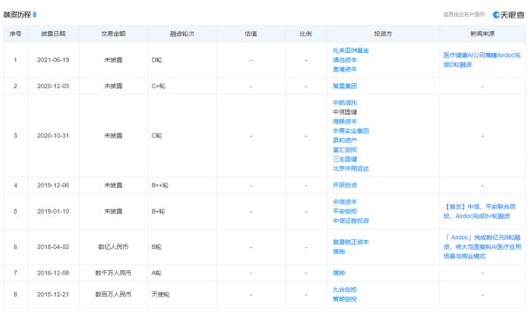 在融资方面,鹰瞳科技的融资能力是较为不错的。据天眼查显示,公司成立至共完成了8轮融资,分别为: