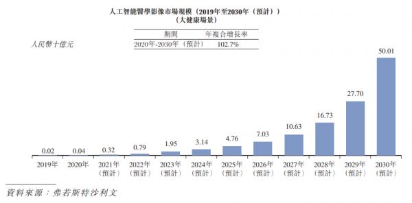 据弗若斯特沙利文资料显示,中国人工智能医学影像市场预计自2020年的人民币3亿元增至2030年的人民币923亿元,2020年至2030年的年复合增长率为76.7%。人工智能医学影像主要用于医疗机构中,以协助医生进行疾病检测及诊断,2020年约占人工智能医学影像市场的86%。