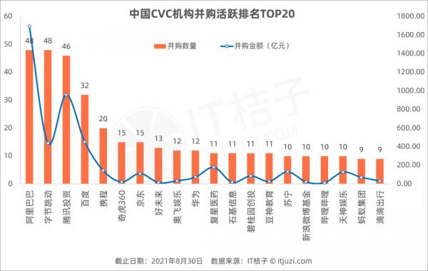 根据 IT 桔子 统计,截止到 2021 年 8 月,中国 CVC 并购方的前三名为阿里巴巴、字节跳动和腾讯,这几家公司历年来收购的公司在 46-48 家。之后较为活跃的还有百度、携程、奇虎 360、京东等等。排名前 20 的 CVC 并购方绝大多数为互联网巨头企业,少数为医药、地产、线下零售集团。