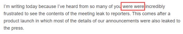 在 The Verge 披露库克的这封内部警告邮件后,许多网友发现第二段中有一个疑似笔误的地方:两个“were”。