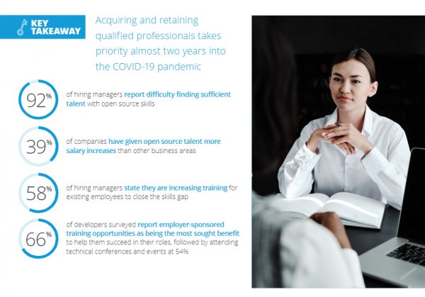 然而,找到那些拥有合适技能的人仍然很难。其中 92% 的招聘经理表示他们很难找到开源人才,但只有 88% 的人表示他们愿意为认证付费,只有 58% 的人表示他们正在增加对现有员工的培训,尽管 92% 的人表示要求更多培训。